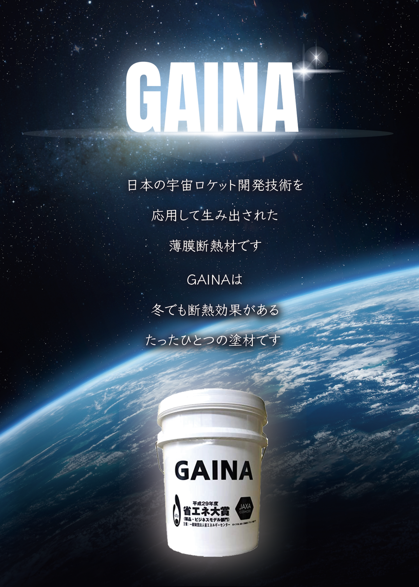 独自で断熱塗材の研究・開発を進めていた株式会社日進産業は、JAXAが開発したこの断熱技術を応用し、一般の人々の生活にも役立てられるように軽量で熱制御性に優れ、塗るだけで断熱が可能な「断熱セラミック塗材」である"GAINA(ガイナ)"を開発しました。